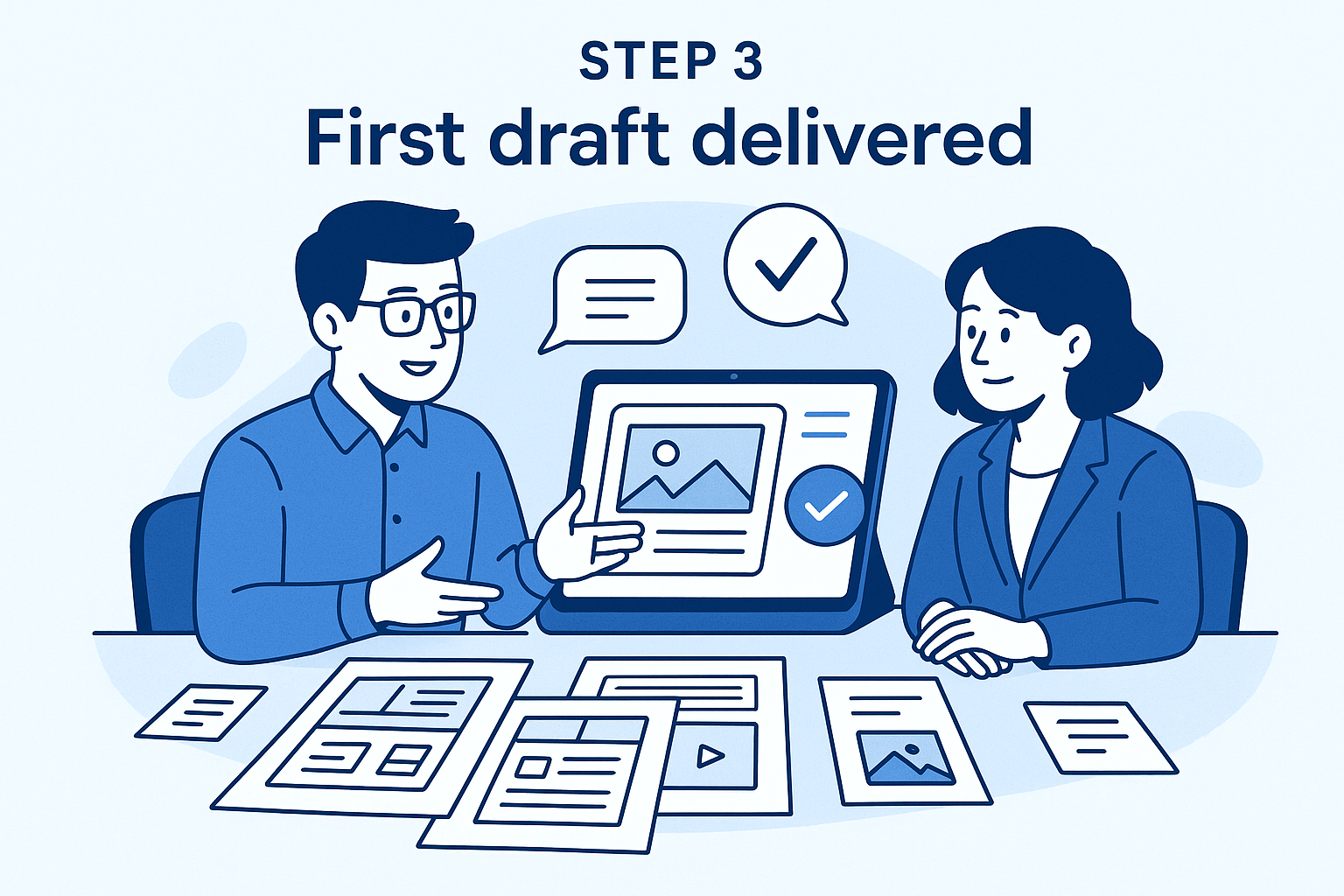 We create an initial version so you can see the direction and confirm we’re aligned before final production.