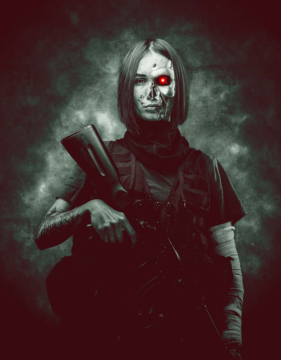 The action will do all the work for you, leaving you fully layered and customizable results that you can further modify. Every element is a single layer. The creativity of how the terminator face is revealed is in your hands!